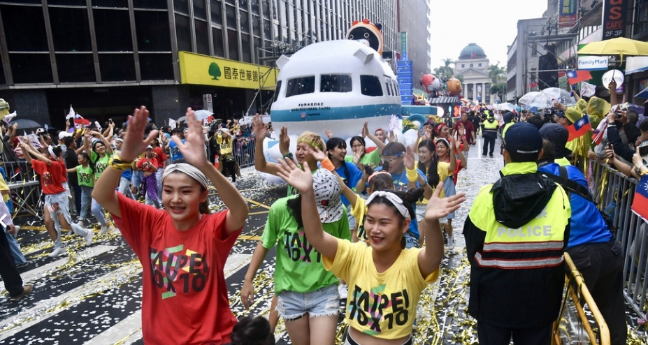「台灣共好 有你真好」亞運台灣英雄暨國慶花車遊行,隊伍今天上午出發後,經衡陽路、襄陽路,及館前路的「英雄谷」,繞行忠孝西路、中山南路抵達終點中正紀念堂,沿途民眾夾道歡迎,包括來自德國、日本等地的留學生也一同為他們歡呼。
