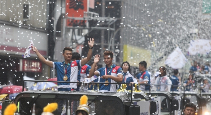 台灣選手在亞運創下佳績,包括體育署、國訓中心、醫療團隊、廚師等後勤單位貢獻良多,這些幕後英雄今天也獲邀,與選手、教練一起參與國慶花車遊行,接受民眾的夾道歡呼。