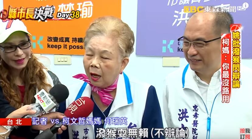 記者 vs.柯文哲媽媽何瑞英:「潑猴耍無賴(不辯論),哈哈哈,潑猴喔,姚文智罵柯P啦,說他潑猴,那他最不潑猴,他那不是潑猴,他最沒路用啦,不是我在講,哈哈哈,潑猴…我也是一隻猴,哈哈哈。」