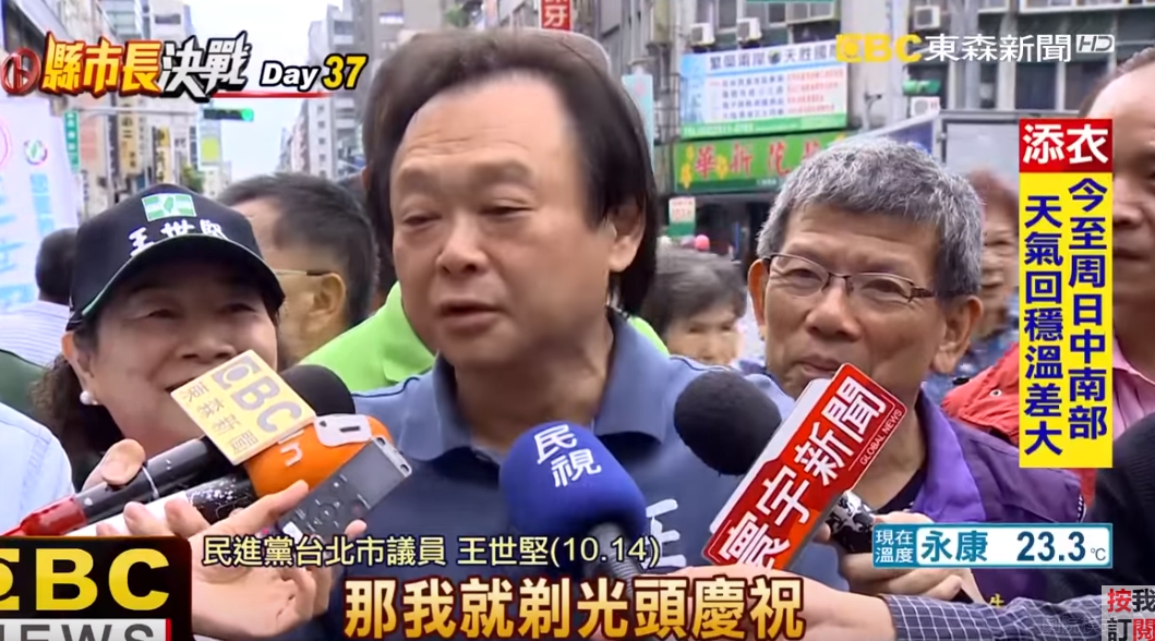 民進黨台北市議員王世堅(10.14):「不可能讓一個,成天作秀、炒議題,搞笑、扮小丑、無厘頭,無心市政的柯文哲,來連任我們首都市長,他連任失敗,那我就剃光頭慶祝」。