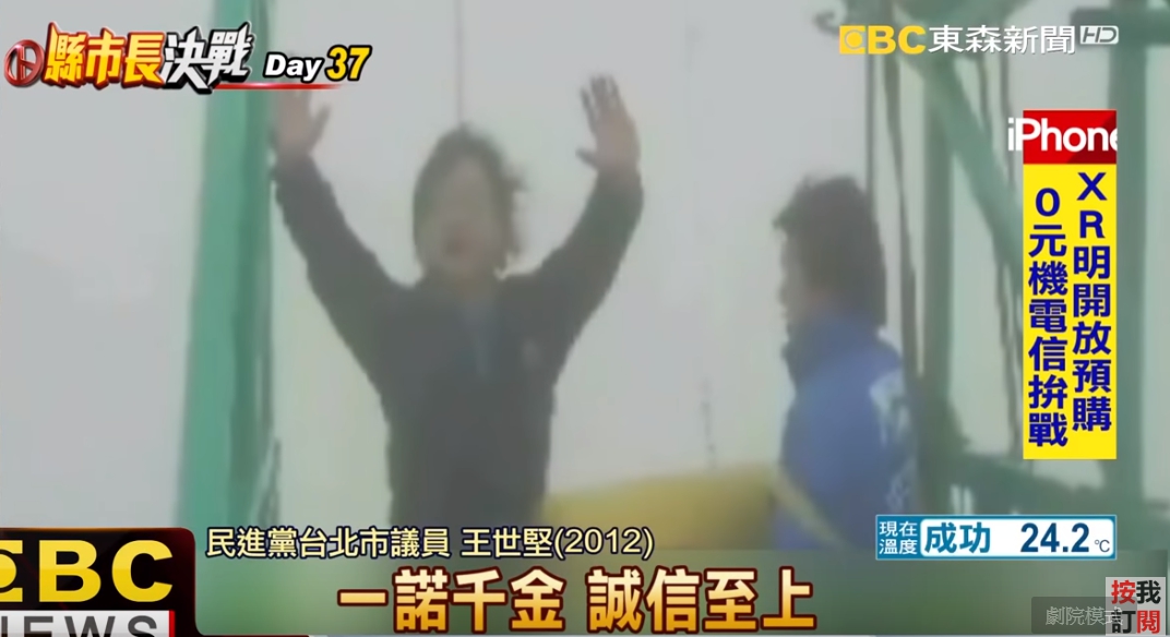 2012年打賭蔡英文,會當選總統,結果後來沒選上,誠信至上的王世堅,二話不說,直接高空彈跳,還有2008年,他打賭,國民黨立委在台北市選舉,不可能「八仙過海」,結果出爐,通通過關,王世堅也兌現跳海承諾,而如今高雄市選戰戰況激烈,就看這次堅哥的賭注。