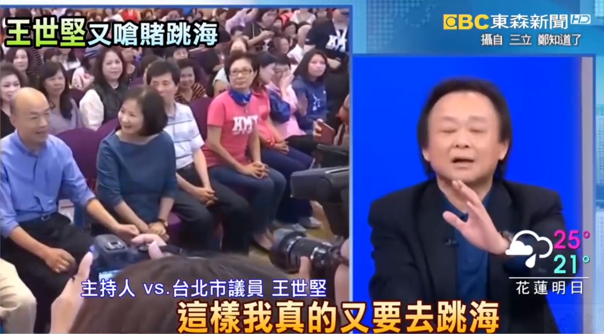 主持人vs.台北市議員王世堅:「我們假定,最後是韓國瑜真的贏了,你會怎麼樣,不可能的事情啦,哈哈 不可能的事情啦,這樣我真的又要去跳海,跳海,跳海了,哈哈哈。」