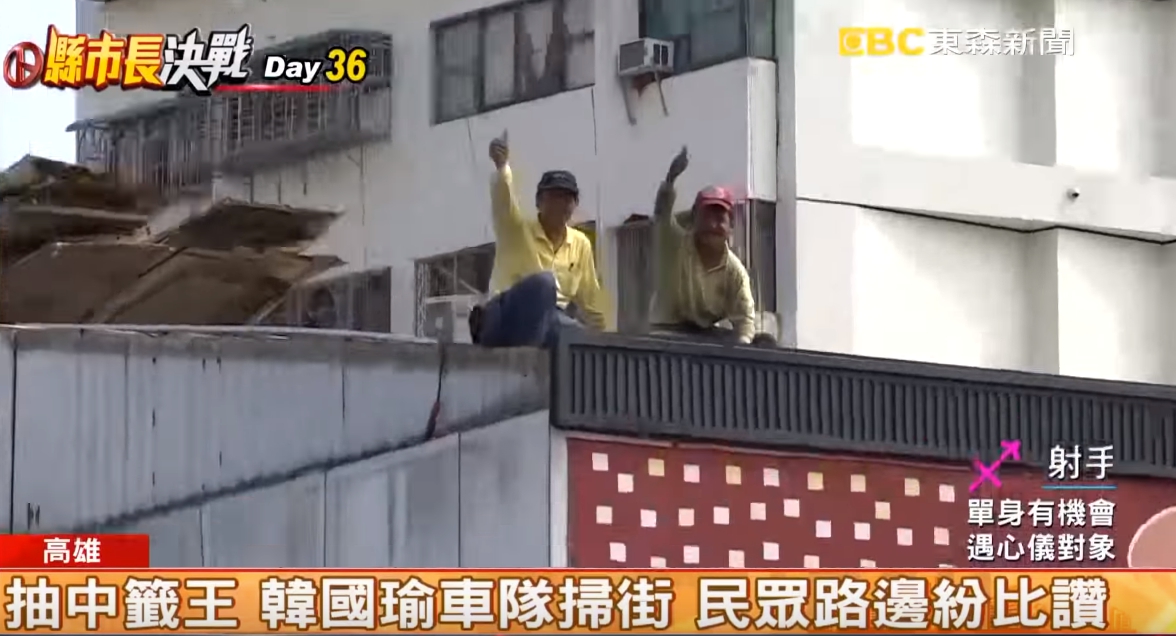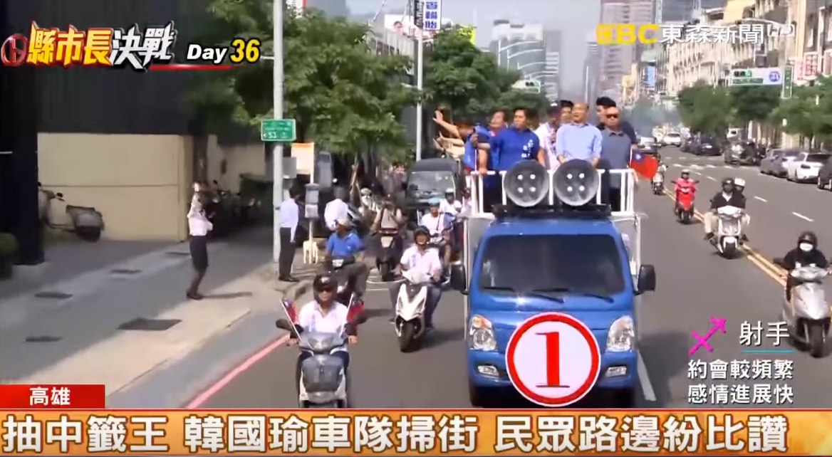 抽中一號籤王的國民黨,高雄市長候選人韓國瑜,步出抽籤會場,被興奮的支持者包圍到幾乎走不動,而韓國瑜的掃街車隊沿途經過的地方,樓上的住戶、錯身而過的汽機車駕駛人,還是早餐店前的年輕人、屋頂上的維修工、路邊的小黃司機,紛紛向他比起大姆指,韓國瑜的旋風,掃向港都的每一個角落。