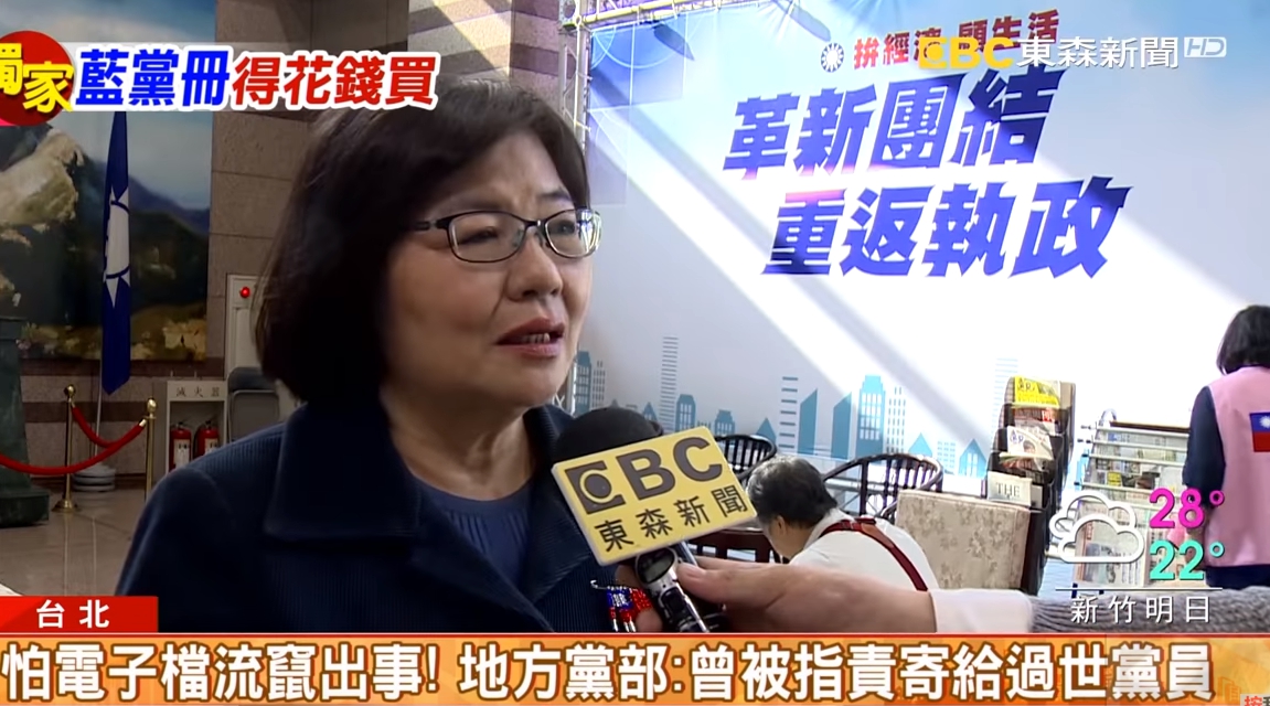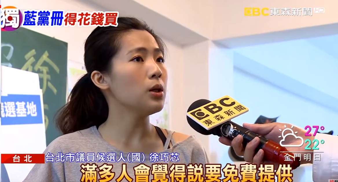 台北市議員國民黨候選人徐巧芯:「一次的話,1個黨員的名字大概是1塊錢左右,滿多人會覺得說要免費提供,但我覺得因為涉及到黨員的個資,那剛好現在黨部也沒什麼錢。」