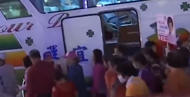 一車一車的遊覽車,就停在造勢晚會外圍,車停好一群一群人下車,大家跟著議員候選人旗幟走,還有人在一旁指揮,年輕臉孔不多,說好的自發性參加呢?