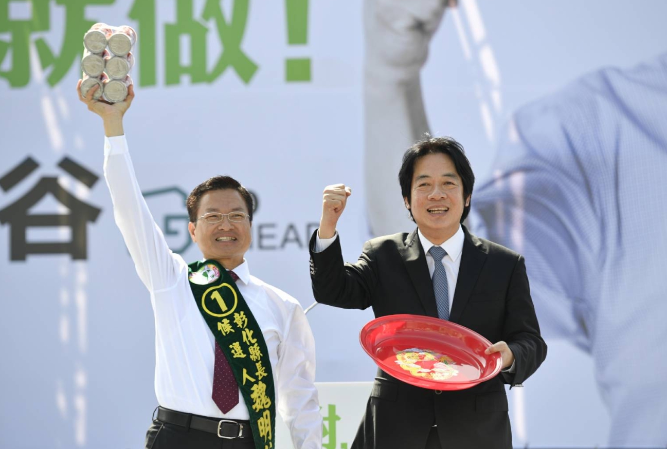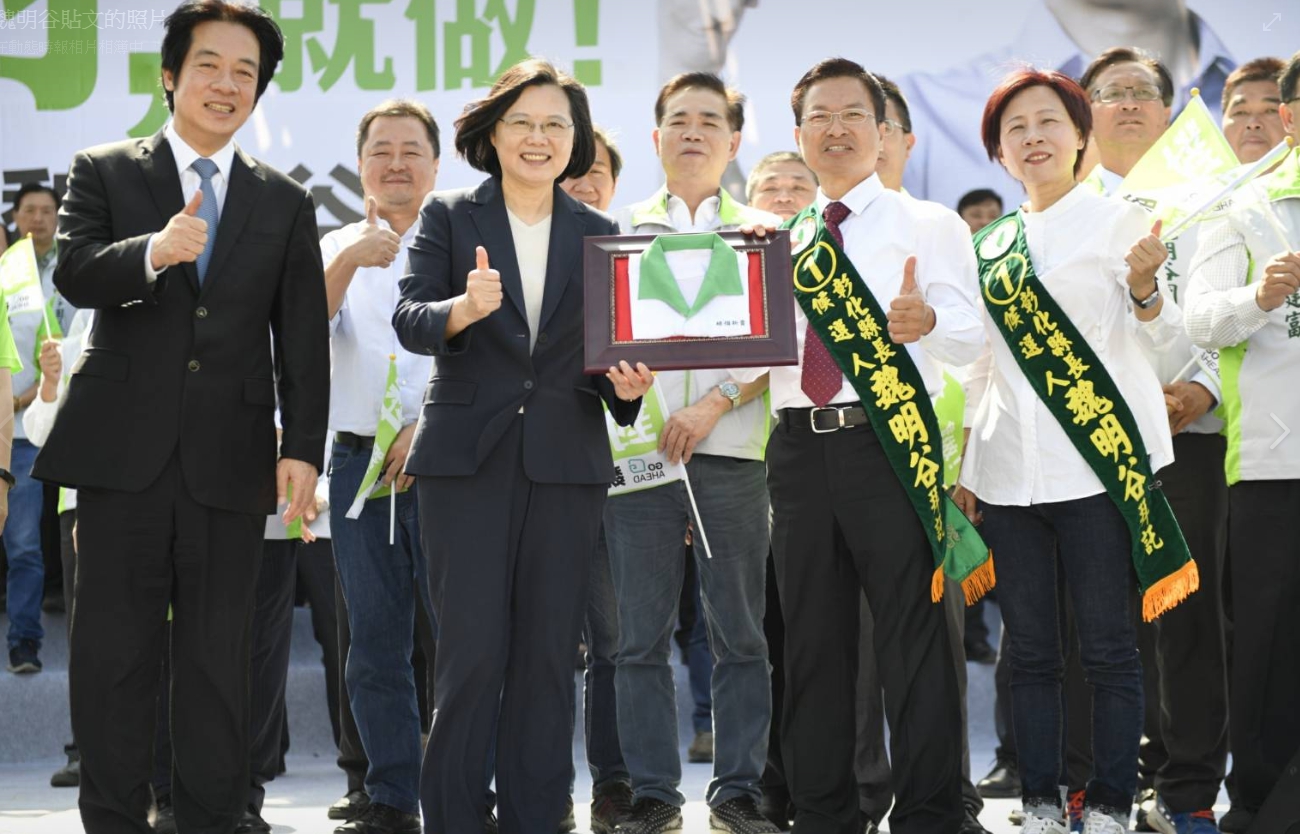 總統蔡英文、行政院長賴清德、立法院長蘇嘉全、彰化縣長魏明谷,台上手拉手營造大團結氣勢,賴清德送上八寶粥幫魏明谷補充戰力,府院黨高層重兵集結,力挺魏明谷連任,終結一任魔咒。