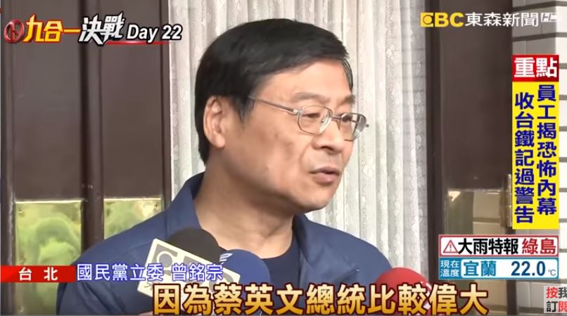 國民黨立委曾銘宗:「包括一般民眾,使用臉書也要偵蒐,已經侵害人民基本權益,(過去馬總統也是被罵的,為何現在蔡總統要來規定?)因為蔡英文總統比較偉大。」