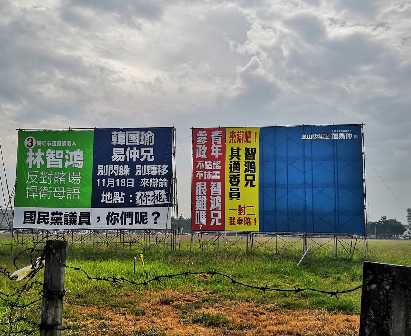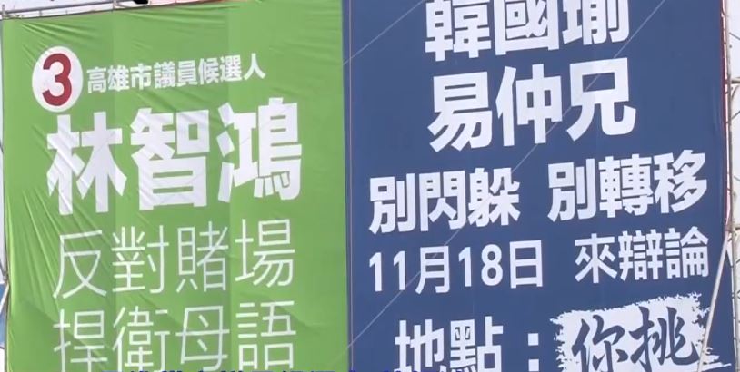 兩個人的故事要從高雄鳳山捷運站旁,空地上的大型看板說起,當初民進黨市議員候選人林智鴻,率先論述反對賭場捍衛母語,要韓國瑜和對手鍾易仲別閃躲,結果鍾易仲沒在怕,開口先酸對方青年參政不造謠抹黑很難嗎,要辯就辯,他一對二奉陪到底,藍綠利用大型看板隔空交火,還真是少見。