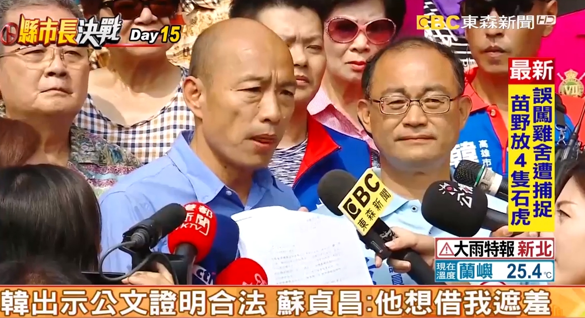 新北市長候選人(民)蘇貞昌:「他19年前租台糖土地,『在下』只是台北縣長,他也是希望我幫他遮一遮,可惜手法拙劣『秒澄清』。」