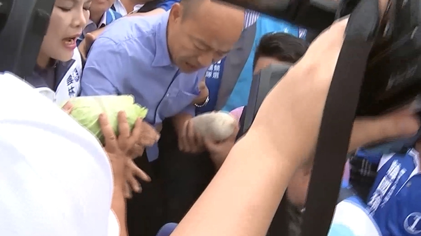高雄市長候選人韓國瑜以雲林女婿身分,參加為農漁民發聲大會師,沒想到上午活動才正要開始,一名黑衣男子拿著高麗菜,攔住韓國瑜和雲林縣長候選人張麗善,當場下跪陳情要他們幫幫忙。農民下跪說生活過得太苦,韓國瑜和張麗善看了都相當揪心。國民黨高雄市長候選人韓國瑜:「我們農民是很辛苦的,剛剛兩位農民下跪陳情,我看得眼淚都流出來了,我們幾千年來,農民是國家最重要的,怎麼會農產品價格一直下滑,真的撐不下去了。」
