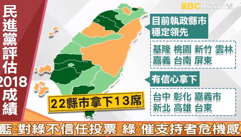 國民黨目前評估,新北、苗栗、宜蘭等8縣市勝券在握,還有8個縣市奮戰中難分軒輊,預估最好成績 ,是8席加上8席開拓空間,民進黨部分目前執政縣市基本上都屬於安全名單,有信心穩住縣市包含台中、彰化還有台東,但不可否認藍綠重兵部署的縣市,全部聚焦南臺灣高雄。