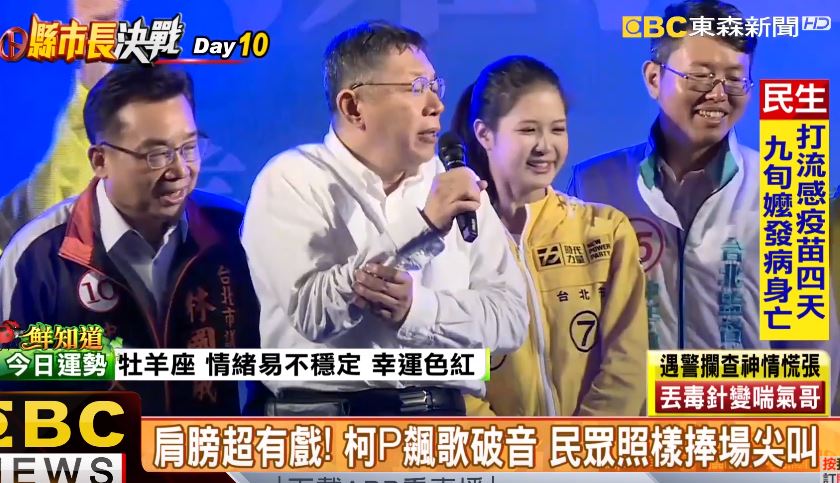 不過才休息5分鐘再度上台開唱,更有眼尖民眾發現,柯市長唱歌肩膀特別有戲。雖然有點破音,不過台下民眾很捧場掌聲沒有少,但柯文哲似乎有點累了。