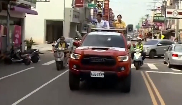 台中市長候選人林佳龍前進后里掃街拜票,旁邊是在地的支持力量「立委洪慈庸」,兩人一同上宣傳車,走入大街小巷。
