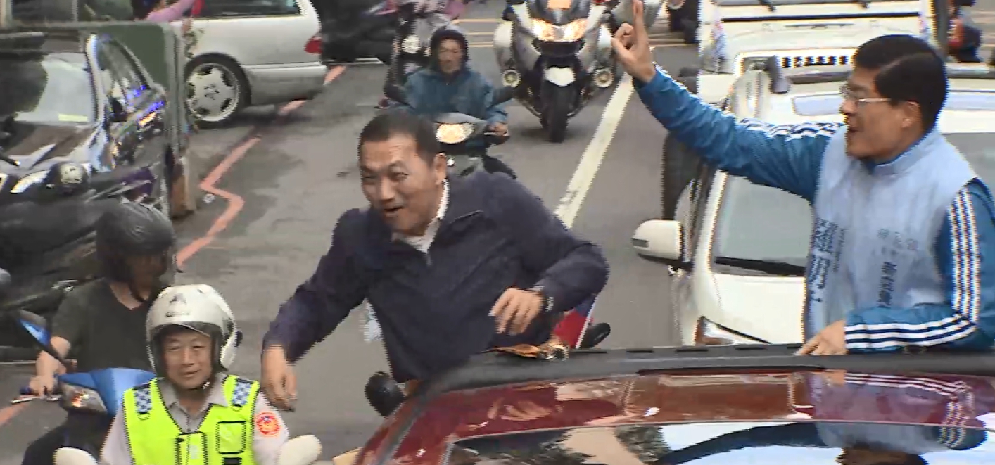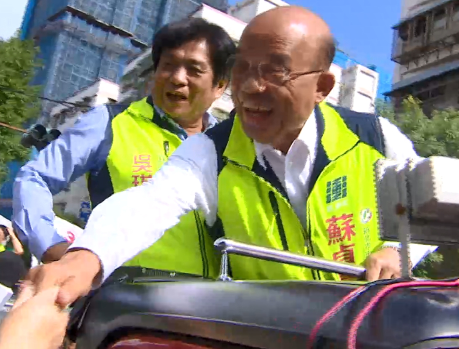 站上吉普車,蘇貞昌賣力跟支持者揮手,周末持續大規模掃街,開出戰車的這招,侯友宜也有。
