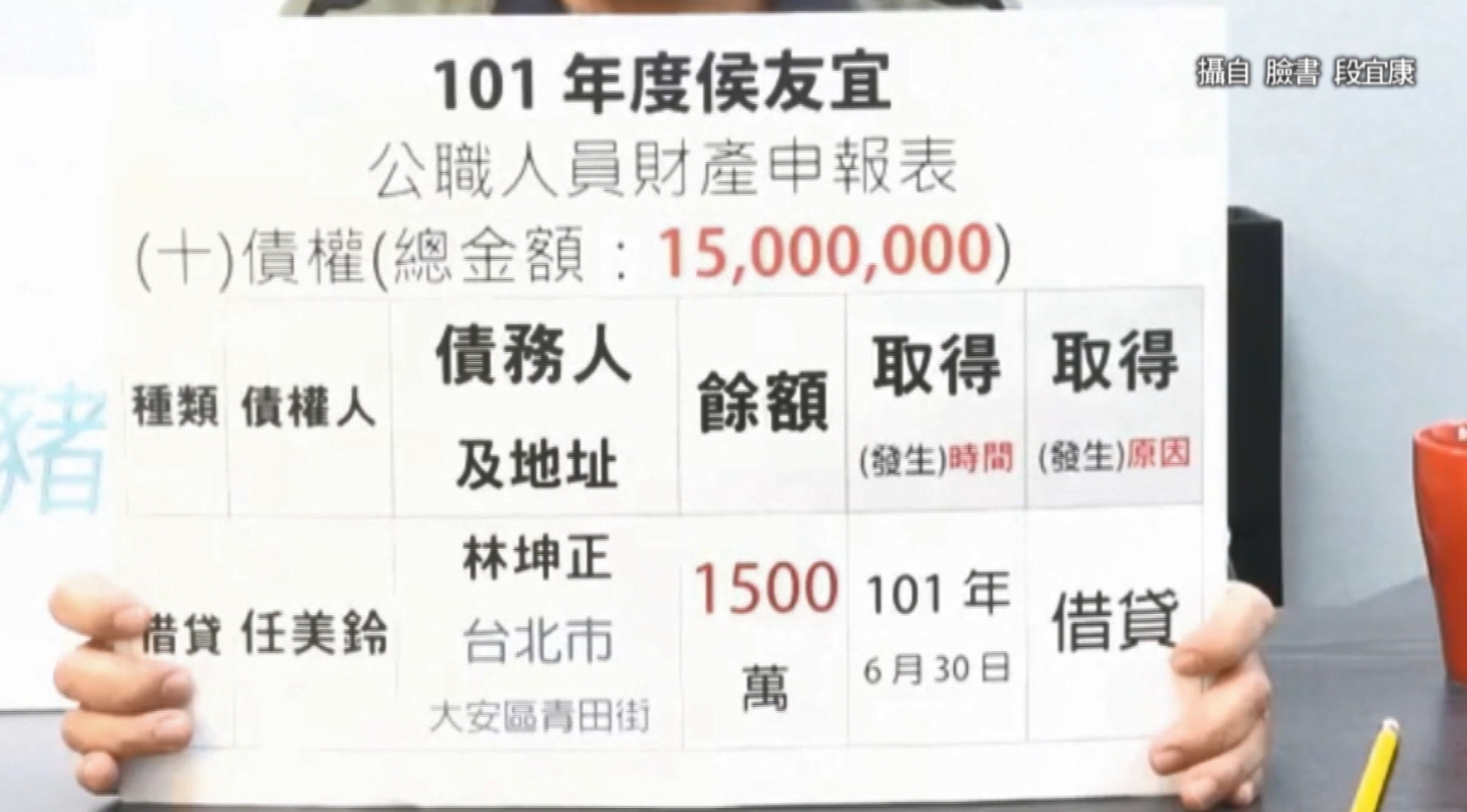 段宜康深夜開直播,指出侯友宜的太太在2012年財產申報時,曾借友人1500萬,不到1年就收回,質疑有無收利息,是否還有債務關係?