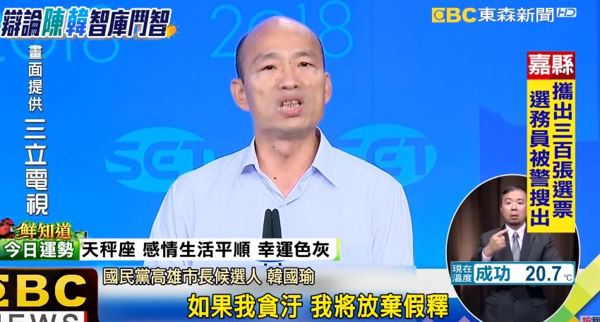 國民黨高雄市長候選人韓國瑜:「我如果當上高雄市市長,如果我貪汙,我將放棄假釋,在牢裡把我關到死,我也將要求我的市府團隊,每一位政務官必須宣示。」
