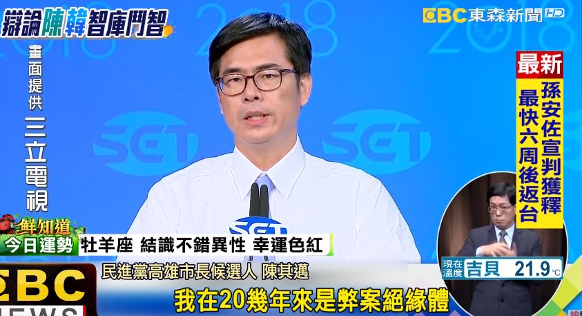 民進黨高雄市長候選人陳其邁:「以人格擔保,我在20幾年來是弊案絕緣體,你從來這些弊案都跟我沾不上邊,查弊案就是要以身作則。」