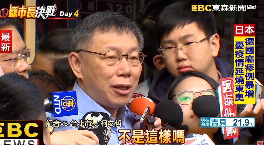 台北市長柯文哲:「我都明白講,就是說很多那種,我們台灣有關係的,各國駐台使節,來拜訪我你知道,最後一定都會問到這個問題,你是不是要選總統?你有什麼計畫?其實那個正確說法,不是中國有人要我選,連中國都在問,不只中國,美、日每個都在問了,老實講這不是因為這樣,搞到今天,今天台灣這次選舉大亂,整個局勢大亂不是這樣嗎?」