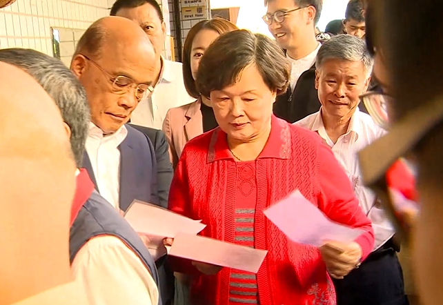 鏡頭轉到另外一頭,民進黨新北市長候選人蘇貞昌,以一身深藍色西裝現身,而老婆詹秀齡則一身喜氣的紅色洋裝,兩人大方在媒體面前曬恩愛,一路上雙手攬緊緊。
