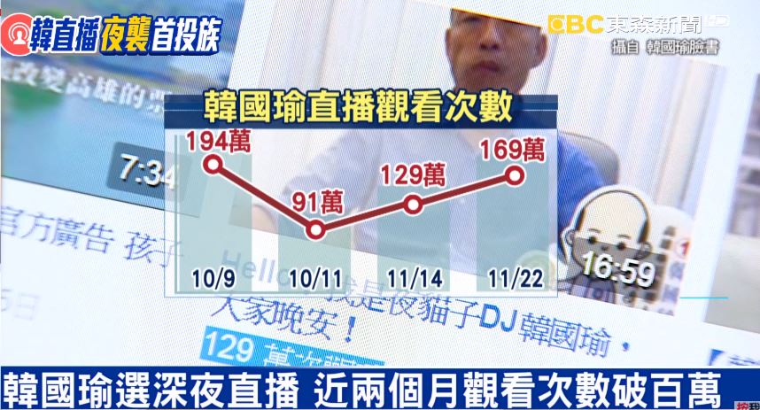 邀請女兒韓冰一同入鏡,韓國瑜在選前最後一次開直播,創下7萬人同時在線觀看,觀察過去幾個月,韓國瑜就愛在深夜開直播。