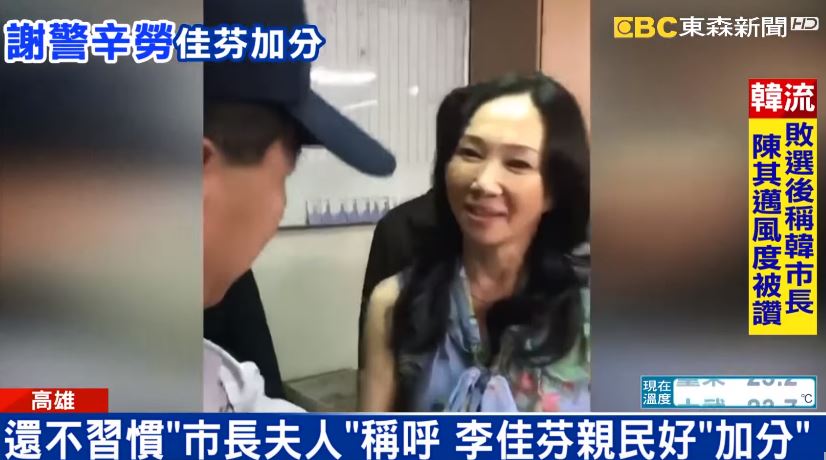 韓國瑜勝選後忙著接受媒體專訪,他的妻子李佳芬也沒閒著,特地到警方設在國民黨部的臨時指揮中心,跟員警一一握手道謝,負責一整天維安的員警,看到李佳芬來慰勞,喊她「夫人」要合照,李佳芬聽到這個稱呼,直說不習慣,親切沒有架子也讓員警們大讚好暖心。