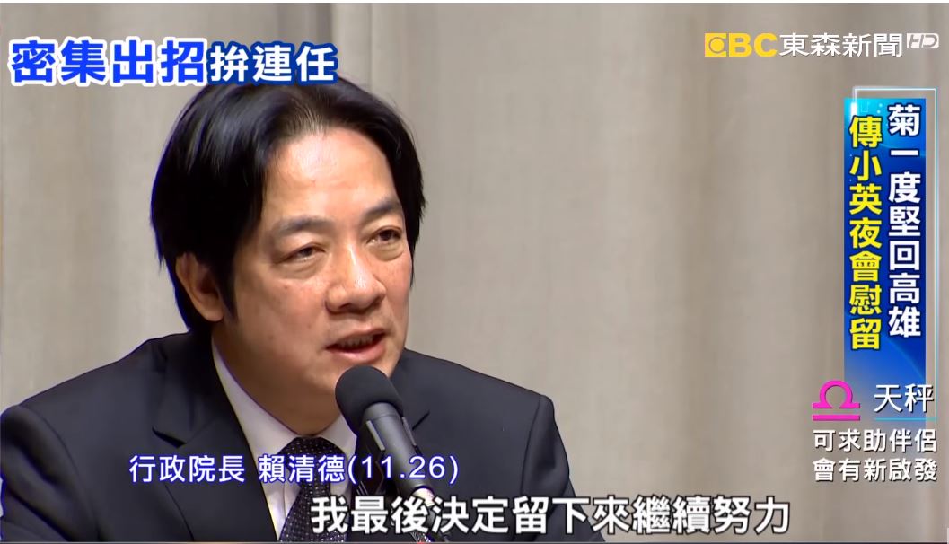 行政院長賴清德(11.26):「我最後決定留下來,繼續努力」。