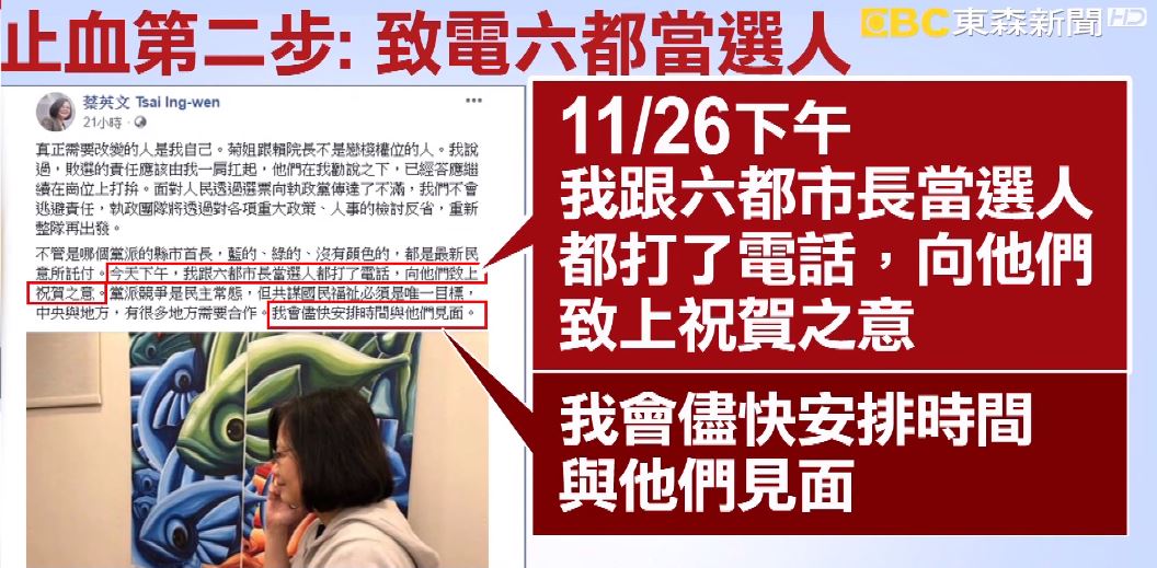 民進黨眾將,在九合一選戰中,逐一被擊潰,主帥蔡英文48小時內危機處理。