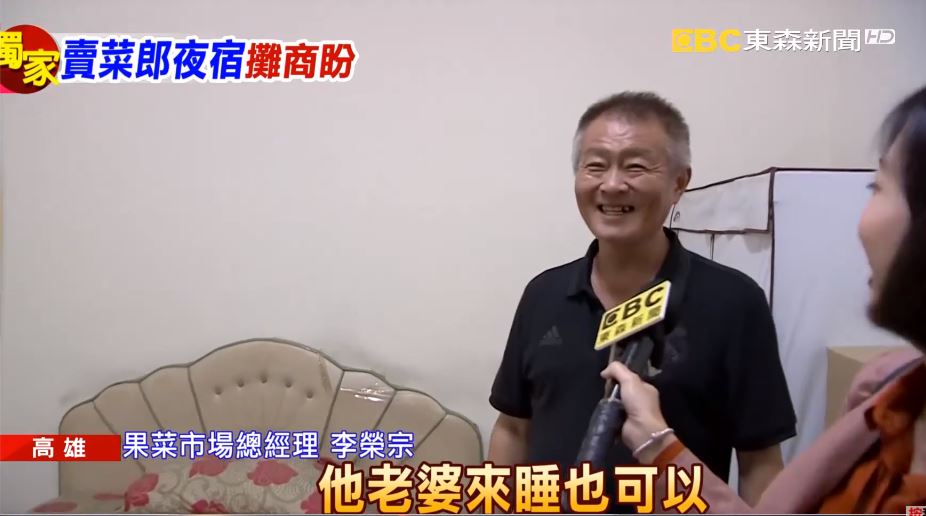 果菜市場總經理李榮宗:「有辦法洗澡嗎?有,浴室在旁邊,那裡有浴室,隔壁有浴室,所以他不用睡在下面,帶睡袋就對了,對對,因為這是兩人床的,他老婆來睡也可以,他老婆來睡也可以」。