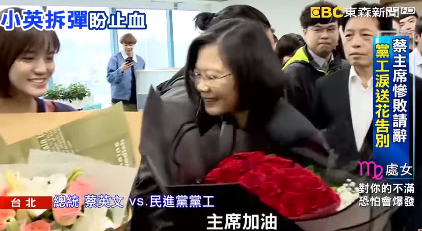 送上鮮花卡片,黨工強打起精神歡送黨主席蔡英文,蔡主席出征不是沒有失敗過,但2018這一役卻是她跌跤傷最重的一次。