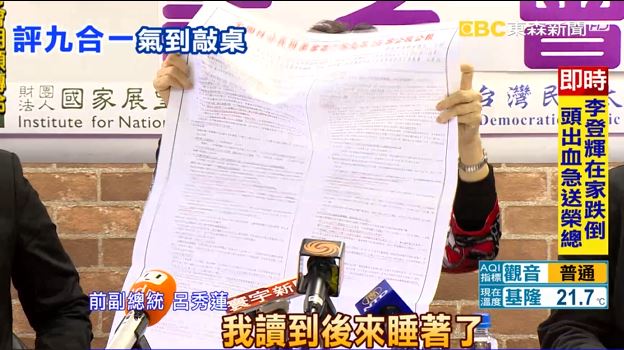 前副總統呂秀蓮:「所有的案子密密麻麻,你看我畫紅線證明我都讀過,但是我必須講,在投票前一天晚上我讀到後來睡著了。」
