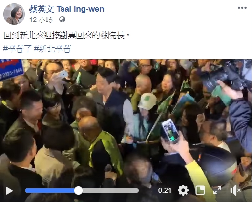 蔡英文也在臉書PO文「謝謝蘇貞昌院長」,謝票之旅有3人同台,增添話題。