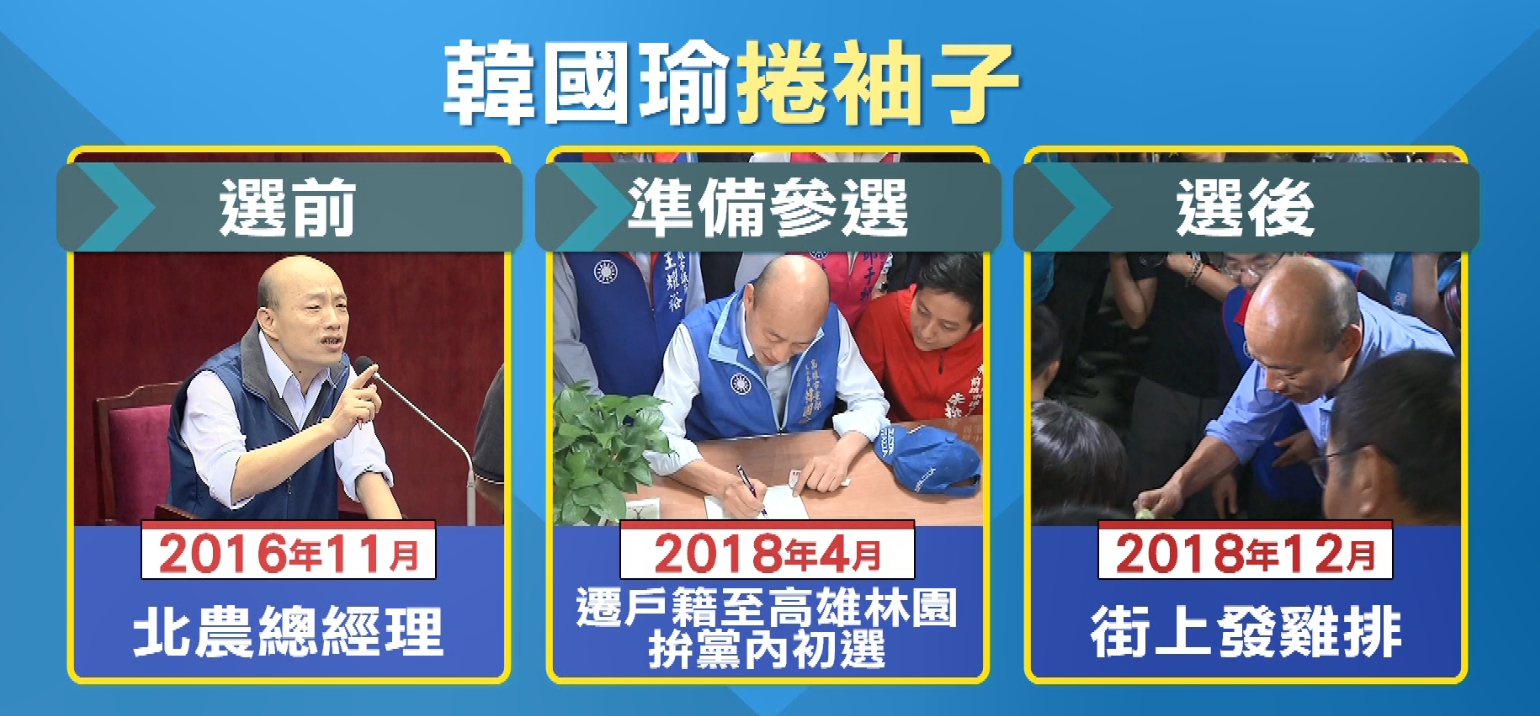 穿著幾乎也沒變過,2016年11月韓國瑜,在北農擔任總經理時期跟王世堅一戰成名,當時就是捲起袖子,今年4月他把戶籍遷到高雄林園要拚黨內初選,打扮相同,選後韓國瑜把綠地翻轉藍天,到街上跟著發雞排,一樣還是穿著襯衫捲袖子。