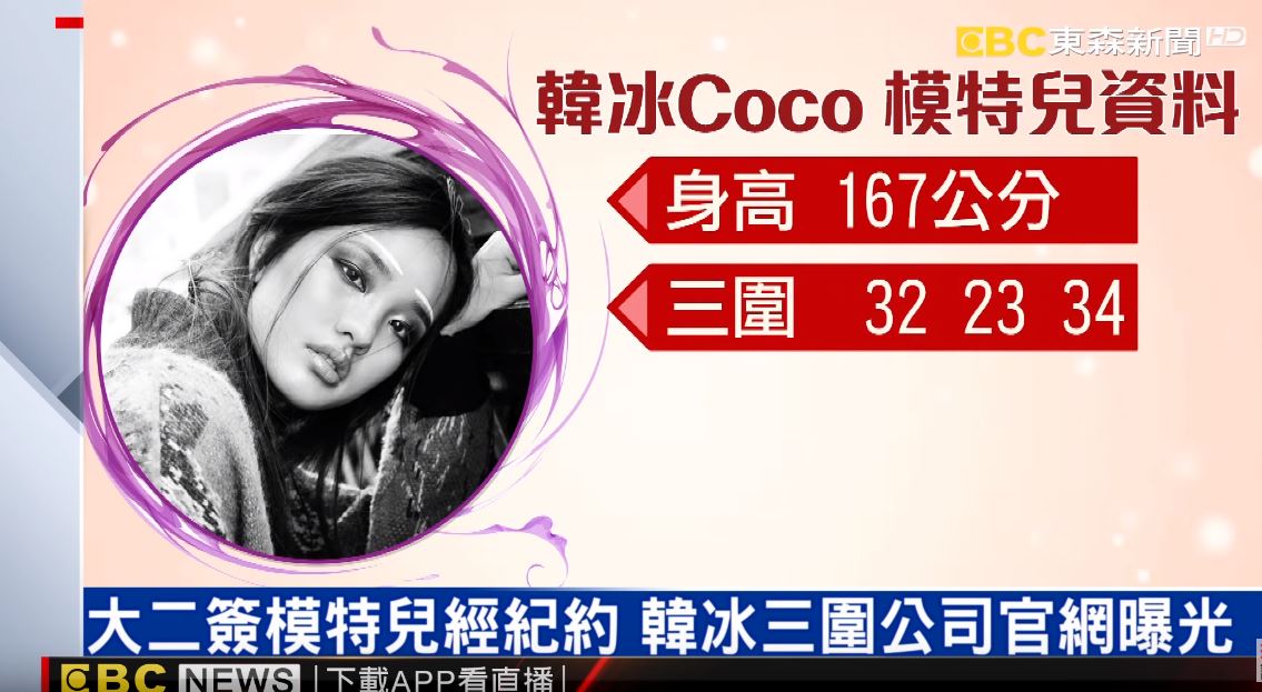 韓冰還利用課餘時間當平面模特兒,這間加拿大模特兒經紀公司官網,旗下有數十名model,而韓冰照片,就放在官網介紹醒目位置,點進去就是,韓冰的模特兒資料,寫著她的英文名Coco,身高167公分、三圍等,衣服穿加拿大尺碼2號,可見韓冰衣架子身材,非常苗條纖細,公司官網裡面,更有多達30多張韓冰作品照,有個性也有甜美。事實上韓冰自己,也在個人臉書上,PO過自己的彩妝練習照,看得出小女生對時尚,相當有興趣。