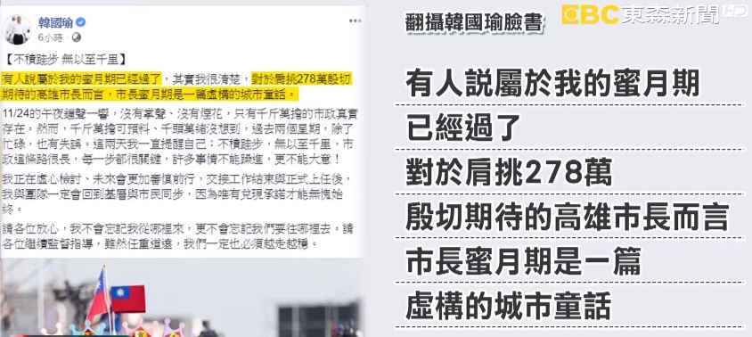 準高雄市長韓國瑜,就職當天的服裝將由實踐大學高雄校區時尚設計學系一手設計打理,鼓勵年輕創意,也展現韓國瑜發展在地文創產業的決心,而這2天沒有公開露面的韓國瑜,6日下午則是在臉書發文,開頭以「不積跬步,無以至千里」勉勵自己,強調自己當市長沒有蜜月期,韓國瑜說市長蜜月期是一篇虛構的城市童話。