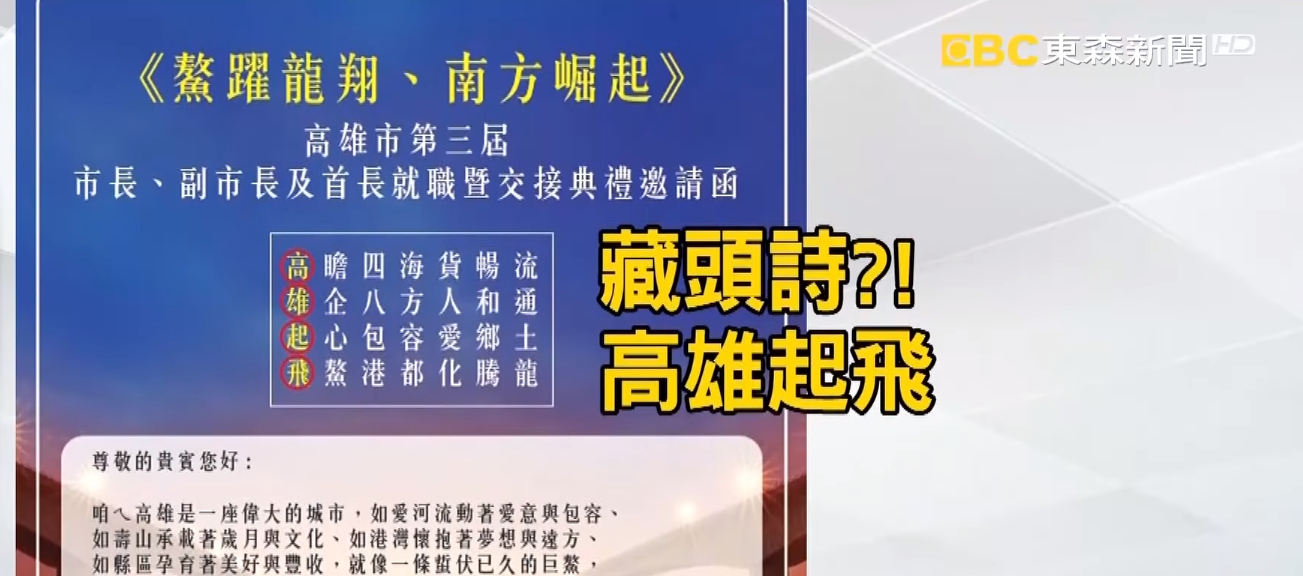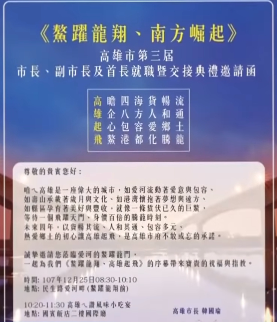 韓國瑜就職典禮邀請函,內容搶先曝光,開頭這個方框,「高曕四海貨暢流,雄企八方人和通,起心包容愛鄉土,飛鰲港都化騰龍。」取每一行第一個字,就是高雄起飛,這藏頭詩創意發想,來自準市長韓國瑜。
