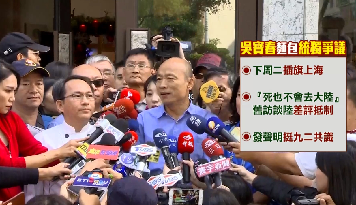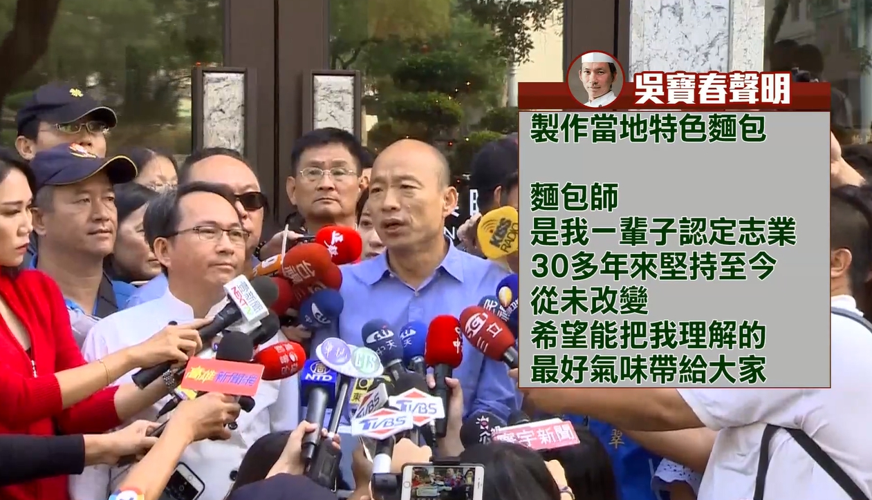 世界冠軍麵包師傅吳寶春,近日擴展版圖到大陸上海展店,沒想到在開幕前夕捲入「統獨風波」,引起大陸網友群起抵制,吳寶春10日趕緊發聲明滅火,表示「身為中國人,是我的驕傲」,強調支持「兩岸一家親」與「九二共識」,此舉激怒台灣人,臉書紛紛湧入負評,吳寶春今(11)日下午也召開記者會,找來準高雄市長韓國瑜滅火。