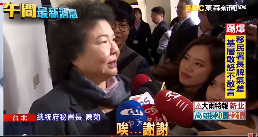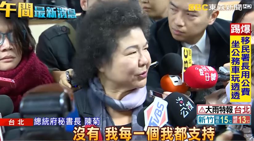 總統府秘書長陳菊:「為了穩定政局對總統有幫助,如果這個時候需要我留下我不會逃避,我有責任支持總統,那總統有需要協助,我當然義不容辭,政務官知所進退(這邊自己有時間表嗎?)謝謝,沒有。」