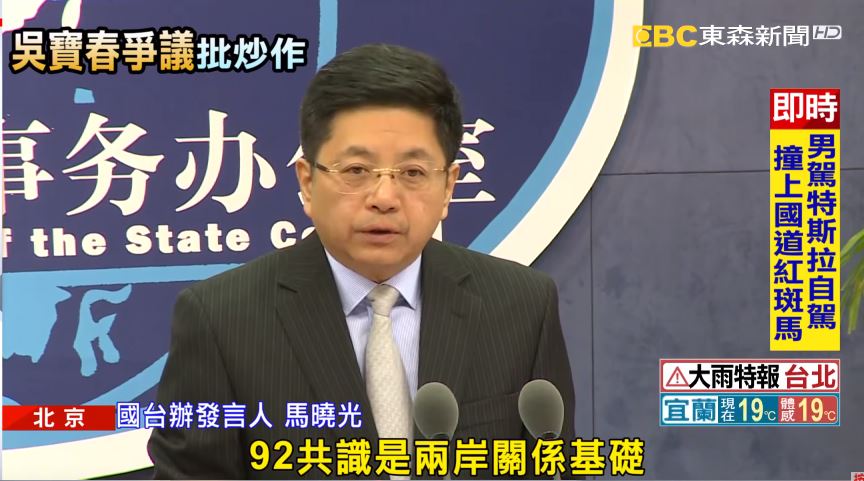 國台辦發言人馬曉光:「台灣人也是中國人,92共識是兩岸關係基礎,吳師傅的聲明表達正確認知和正常感情,而綠營政客和台獨勢力對他瘋狂圍攻,才是一種政治扭曲,才是一種政治破壞」。