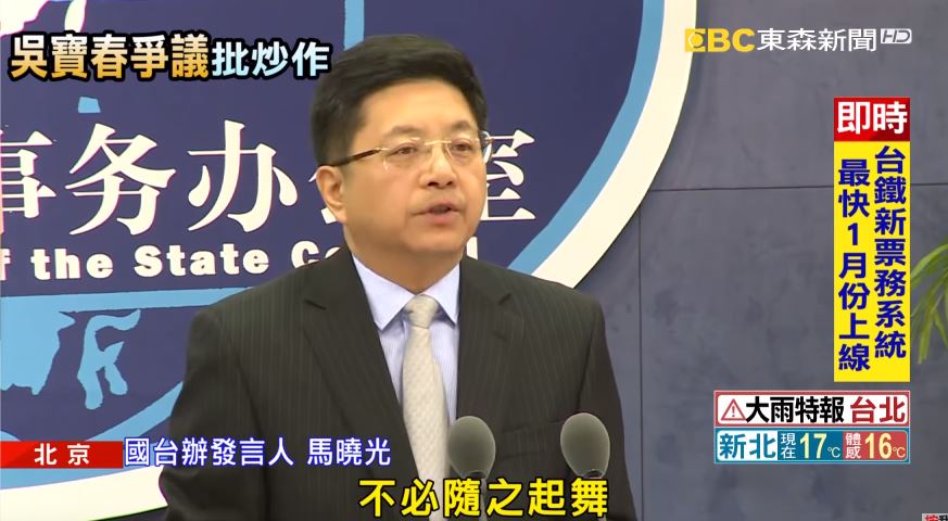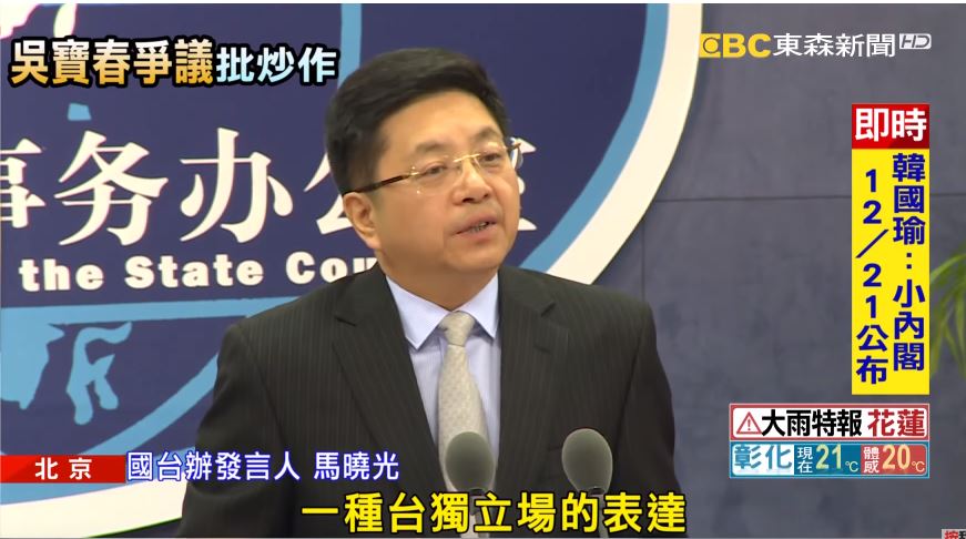 國台辦發言人馬曉光:「這個事情源頭如果你仔細細查,是因為吳寶春在台灣島內說的一些話,被台獨或持特定立場媒體加以歪曲,把他說成是一種台獨立場的表達,從而引起大陸網友關注」。