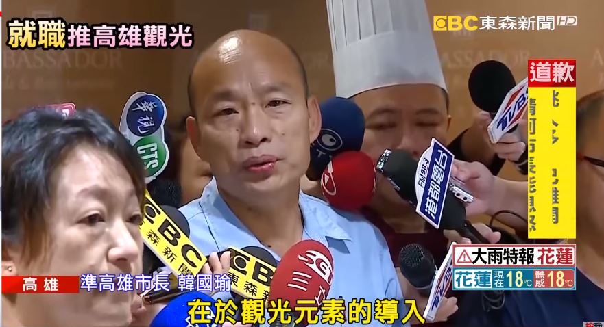 準高雄市長韓國瑜:「(可以)就職的跟現任的,很傳統的行禮如儀把他辦完,但是我們覺得,這對我們高雄推展觀光來講是一個損失,所以我們整個交接會非常側重在於觀光元素的導入」。