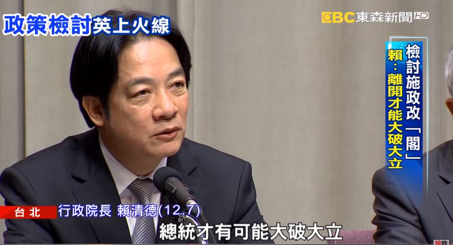 行政院長賴清德(12/7):「也只有我離開,總統才有可能大破大立,新的局面才有可能產生」。