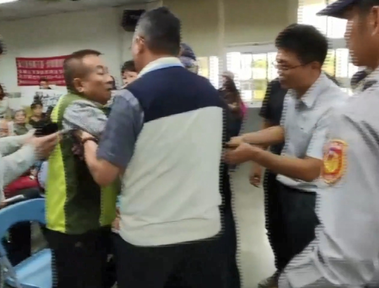一言不合竟直接翻桌,民雄鄉長何嘉恒重心不穩跌坐講台上,左手扶著後方藍色椅子右手撐地,嘉義縣議員黃嘉寬突如其來舉動,嚇壞在場所有人,就怕爆發第二波衝突,警方跟公所人員連忙跑到前方,安撫黃嘉寬情緒,並把鄉長扶起來,但黃嘉寬還是很不滿,拿著一疊資料咆哮。