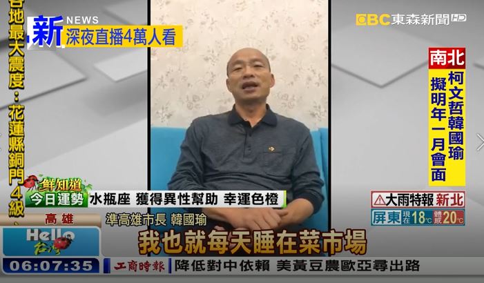 準高雄市長韓國瑜:「蔬菜就是蔬菜,我根本分不清楚,所以上班的時候非常非常的緊張,而且在這個上班之前,我就失業很長一段時間,到了台北農產之後,我也就每天睡在菜市場,這一睡整整睡了4年半」。