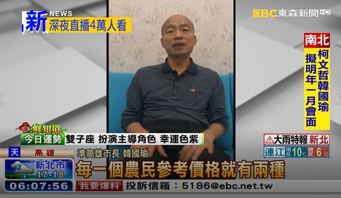 準高雄市長韓國瑜,13日沒有公開行程,晚間將近11點,透過直播,不但穿上北農的制服,大談在北農的日子,還說起未來想把高雄農產打造成北農第二,24分鐘的直播,也吸引近4萬人次同步觀看。