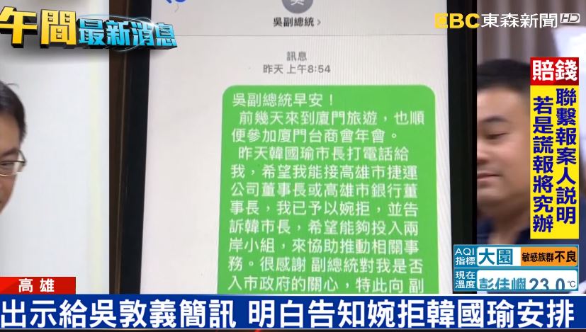 不過就在韓國瑜宣布小內閣名單的這一天,一則楊秋興傳給國民黨主席吳敦義的簡訊曝光了,上頭明白寫著,自己已經婉拒韓國瑜市長,高雄捷運公司董事長或是高雄銀行董事長職務的安排,未來希望的是投入兩岸小組的工作。