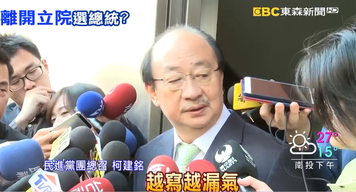 民進黨團總召柯建銘:「9月政爭最大的問題,就是說馬英九破壞憲政體制,馬英九違法亂紀,到現在還在狡辯,他寫這本書越寫越漏氣,(馬英九說太陽花害死台灣?)這是馬英九觀點,是馬英九害死台灣。」