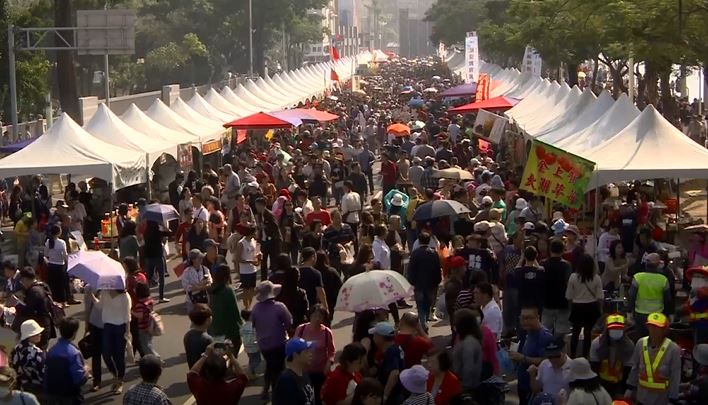 這就是位在高雄愛河畔,韓國瑜就職典禮現場邊的120個攤販區,主辦單位還設立了電視牆,轉播就職典禮畫面,延續前一天開市的盛況,就職當天一早攤販區,更是湧入大批的遊客,賣烤香腸的業者忙到翻卻是累得好甘心。