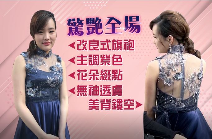 一襲淡紫色透膚旗袍,襯托雪白肌膚,搭配垂墜線條的耳環,韓冰看來格外耀眼動人。