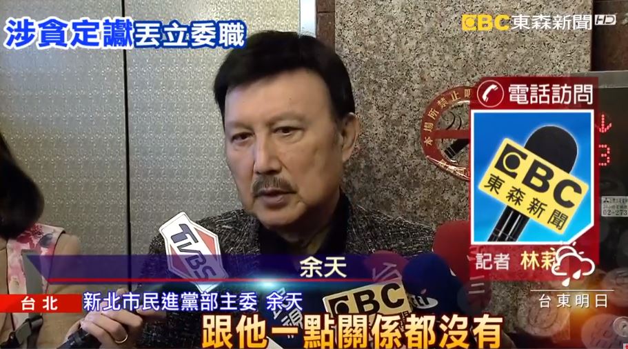 新北市民進黨部主委余天:「是他的助理去遊說的,跟他一點關係都沒有,所以司法改革是必須要的啊,呵呵,唉真是可憐啊」。