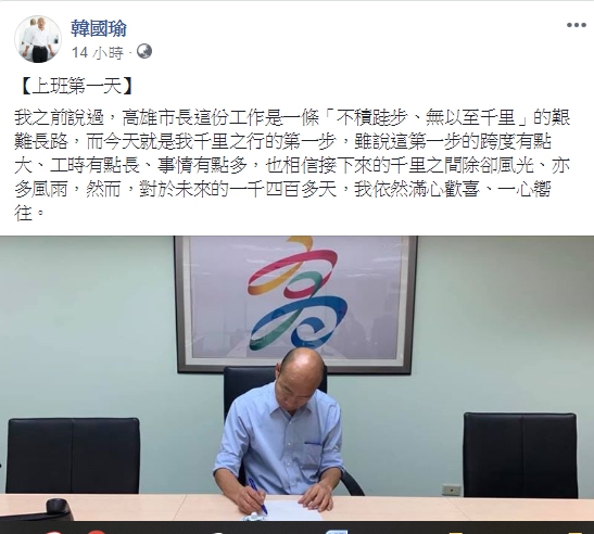 六都市長在就任後,照慣例參加行政院會,新任高雄市長韓國瑜在昨天(26號)忙完一天的行程後,晚上就北上參加今天的院會,這樣拼下來也讓他忍不住,上任後首次的臉書發文,就小抱怨一下工時太長,但是馬上又轉回來說會努力打拼。